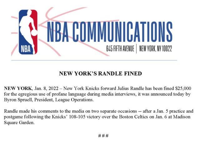 NBA公布罚单!兰德尔被罚2.5万美元,采访滥用亵渎性质语言