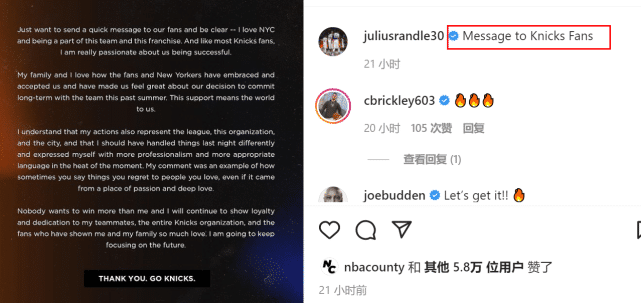 随后,兰德尔曾更新社媒,为自己的倒竖拇指的不理智动作向球迷正式道歉。他在社媒上写道:“我爱纽约。能够被这支球队接纳,我感到非常荣幸……我和家人都非常热爱尼克斯和这里的球迷……我明白,我的行为也代表了联盟、这支球队和这座城市,我应该以不同的方式处理昨晚的事情。在我不理智的时候,我应该更加职业,用更加合适的语言来表达自己……”