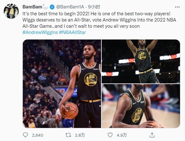 勇士队近日也和韩国男团Got7成员BamBam达成合作,后者成为勇士队全球大使,Bambam还在自己的社交媒体上晒出了勇士官方赠送的97号球衣,他本人在尽力地为维金斯拉票!目前来看效果非常惊人,因为BamBam在泰国有着极高的人气,他的粉丝疯狂为维金斯投票!