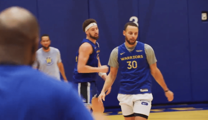 勇士训练库里连线汤神曝光!击掌撞肩表情严肃,美媒:将近千天没见了