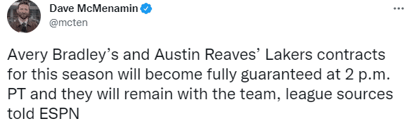 去年夏天,布拉德利重返湖人,签下一份1年264万美元的非保障合同,合同转正的截止日期是1月8日;凭借出色的表现,布拉德利终于赢得一份保障合同,留在湖人继续冲击总冠军。