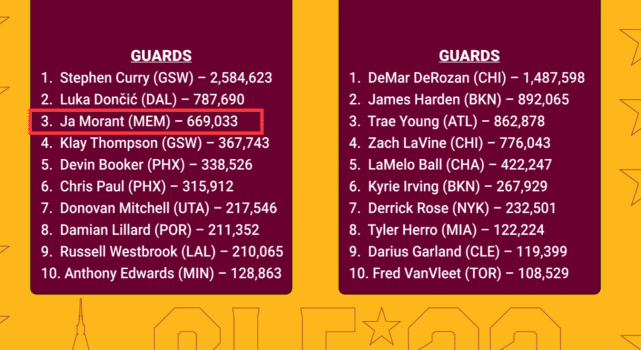 在NBA今天公布的首轮全明星投票中,莫兰特也是以接近67万票高居西部后场第三位,仅次于库里和东契奇。按照最近这个趋势,莫兰特后续有希望在票数上超过东契奇。总而言之,即便莫兰特最终无缘首发,他也会没有悬念入选全明星,让我们拭目以待!