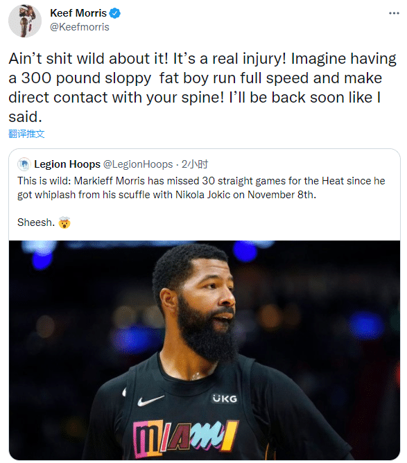 小莫里斯回应因伤连续缺席30场比赛,发推写道:不开玩笑,这一点也不疯狂!我真受伤了!想象一个300磅的邋遢胖男孩全速跑起来,直接撞到你的脊椎!但我会很快就会回来的。