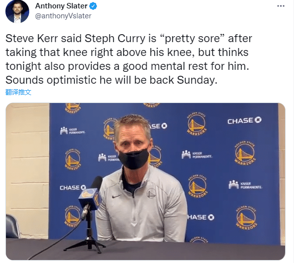 科尔还透露库里股四头肌的伤情,他表示库里抬起膝盖时感到“非常酸痛”,但今天可以让他获得很好的休息;勇士记者表示库里下周一复出很乐观。