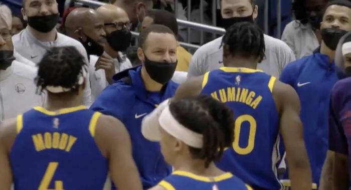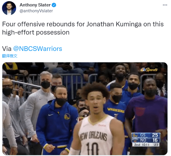 库明加疯狂一个回合直接打停鹈鹕,点燃勇士替补席,因伤休战的库里从替补席站起来,握拳怒吼并且和库明加击掌庆祝。