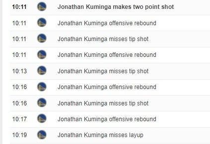 第二节10分20多秒,库明加持球单打,杀到禁区上篮不进,随后库明加开始疯狂抢板,从10分19秒到10分11秒,库明加在内线一挑三疯狂抢到4个进攻篮板,展现不俗的弹跳能力,海耶斯、坦普尔沦为背景板;库明加连续5次出手最终把球打进。