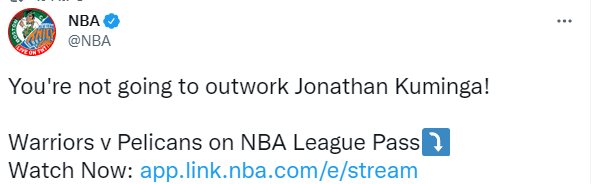 暂停回来,库明加吃饼空接暴扣,上半场出战5分钟7投2中拿到5分5篮板1助攻,NBA官方转发库明加抢篮板一幕,配文写道:你不会比库明加更努力。