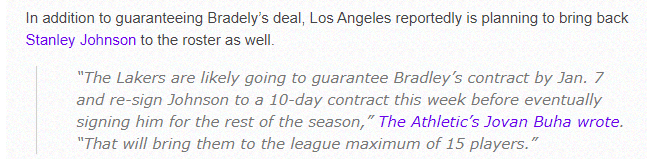 另一记者Jovan Buha报道,湖人将在1月8日之前把布拉德利的合同转成全额保障合同,湖人会用10天合同重新签下斯坦利-约翰逊,然后最终签约到赛季结束。
