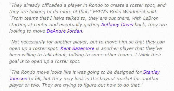 该名记在节目中表示:他们(湖人)已经交易掉了朗多,创造了一个花名册上的位置,他们正在寻找更多的机会。由于詹姆斯在中锋位置表现很好,安东尼-戴维斯也越来越接近复出,他们正在考虑交易德安德鲁·乔丹,贝兹莫尔是另外一名他们愿意与其他球队谈判的球员,湖人想要腾出更多的阵容名单,正尝试如何做到这一点。