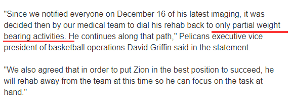 自得到去年12月的最新检查结果后,我们的医疗团队决定减轻锡安的恢复工作量,让他只接受部分承重训练。在未来的一段时间内,他将持续这个过程。我们也与锡安达成了一致,为了让他得到最好的恢复效果,目前锡安正处于离队状态进行恢复训练,这有助于他更专注于康复工作。