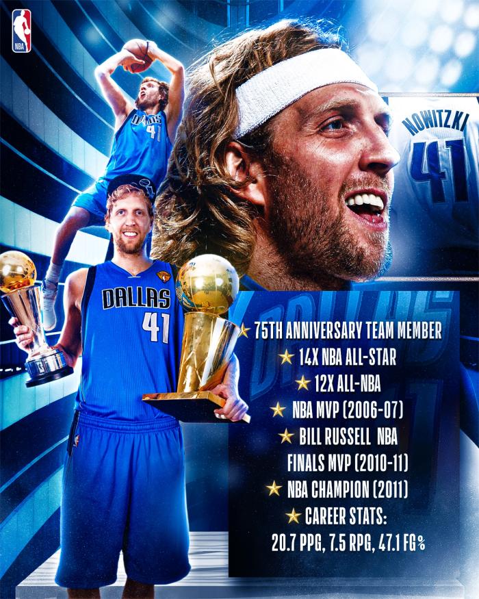 诺维茨基职业生涯21个赛季都为独行侠效力,总共出战1522场常规赛,场均得到20.7分7.5篮板2.4助攻,14次入选全明星,12次入选最佳阵容,1次常规赛MVP,2011年带队夺得队史首冠并且加冕FMVP,成功入选NBA历史75大球星榜。