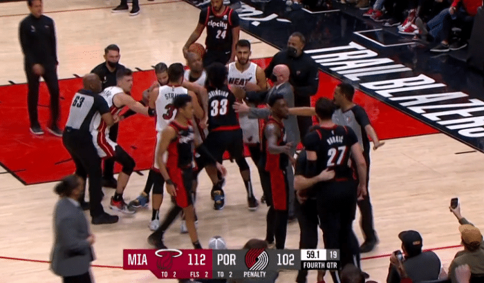 比赛还剩59秒,努尔基奇掩护撞倒希罗,希罗情绪暴怒,站起来从背后推了努尔基奇一把,努尔基奇立即回应,一巴掌打到希罗的头部,双方互喷发生冲突,多名球员围过来,所幸及时拉开双方阻止冲突恶化,经过回放之后,两人都被驱逐离场。