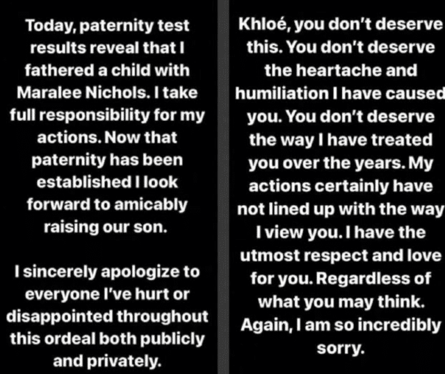 来源:JRS直播网01-05 19:45JRS直播网01月05日讯 稍早之前,NBA球星特里斯坦汤普森在自己的社交媒体上公开发文承认自己出轨并且有一个私生子,并且向自己的前妻科勒卡戴珊进行了诚挚的道歉。在文中TT承认自己在和科勒交往期间出轨自己的私教玛拉莉尼克尔斯,并让后者怀上了自己的孩子,不过对于前妻科勒,他还是怀有极大的尊重和爱,认为科勒不应该承受自己给她带来的一系列心痛和羞愧,自己确实愧对于他。