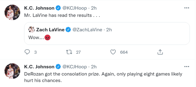 拉文则在NBA官方宣布月最佳后,更新社媒写道:“哇哦(不满表情)”。公牛记者KC-约翰逊转发了拉文的社媒,写道:“拉文先生已经看到(月最佳评选)结果了……”。约翰逊还转发提名球员的名单写道:“德罗赞拿到了安慰奖,只打8场比赛影响了他的入选概率。”