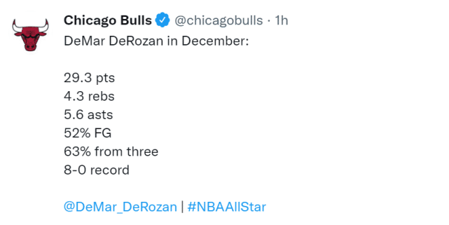 确实如此,毕竟,德罗赞因触发协议,错过了12月的3场比赛,这也很大程度上影响了他的入选。公牛在12月份取得了9胜2负的战绩,输掉的两场比赛都没有德罗赞。