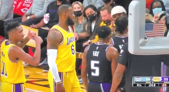 在跳球时,詹姆斯跳赢并且把球拨给威少,国王只能采取犯规战术,威少两罚一中;之后国王续命三分不中,威少两罚全中,比赛悬念彻底没有了,最终湖人主场拿下胜利。
