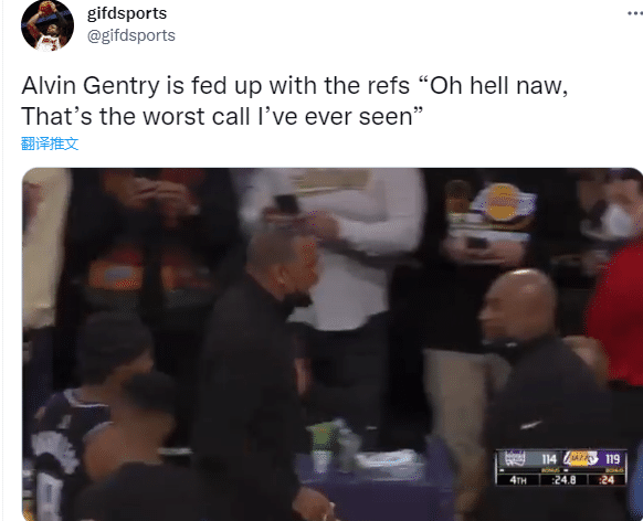 按理说蒙克两罚不中,国王应该直接获得球权,但裁判因技术故障而响哨吹停比赛,然后裁判站在一起商量,詹姆斯等球员以及两队主帅都围过来,最终裁判吹罚湖人和国王跳球,对于这样吹罚,国王主帅金特里瞬间暴怒,气得怒摔战术板,并且怒喷裁判:Damn,这是我见过的最糟糕的判罚。