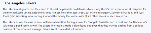 就像去年6月份的情况一样,湖人很难再交易中找到德安吉洛-拉塞尔的买家,而八村垒的价值也有所下降。湖人对做交易的兴趣是巨大的,但考虑到他们可能会从一个严重妥协的杠杆位置进行交易,人们怀疑这样的交易是否会浮出水面。