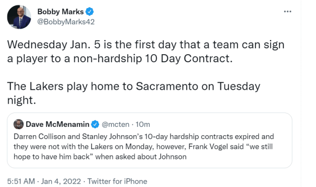 在10天合同期内,斯坦利-约翰逊打了5场比赛,其中3场首发,场均出场25.2分钟,贡献6.8分2.4篮板1.4助攻1.2抢断。达伦-科里森打了3场比赛,全部替补,场均出场12.3分钟,贡献1.3分1.3篮板0.7助攻。科里森基本不会回归,而约翰逊是湖人想要留下的目标。
