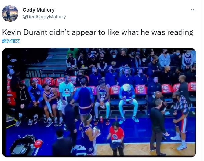 第四节,杜兰特哈登等主力球员,都只能坐在冷板凳上,看着替补球员追分。虽然一度追到只差10分,但主帅纳什仍然没有换上主力,也算是奖赏替补球员的努力。杜兰特自己则在看了技术统计单之后,显得相当不满,将纸揉搓成一团,直接丢到了座位底下。杜兰特这场比赛的表现的确糟糕,第二节甚至6中0只得1分,全场的命中率也很低。