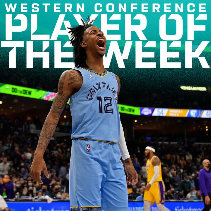 上周莫兰特带队拿到3胜0负的战绩,场均轰下34.7分6.7篮板4.7助攻——对阵太阳轰下33分4篮板4助攻,对阵湖人狂砍41分10篮板,对阵马刺又砍下30分8助攻6篮板,莫兰特打出超强统治力,带队先后击败太阳、湖人等强敌。
