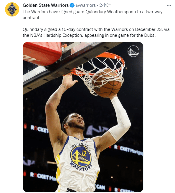 勇士官方正式宣布用双向合同签下奎因达里-韦瑟斯庞,之前拿着勇士十天短合同,获得一次上场机会,上场14分钟得到6分1篮板1助攻1盖帽;25岁的韦瑟斯庞曾为马刺打过31场比赛,场均上场6.4分钟得到1.9分;此前勇士裁掉杰夫-道丁,腾出名额签约马刺旧将,勇士另一位双向合同球员是穆迪。