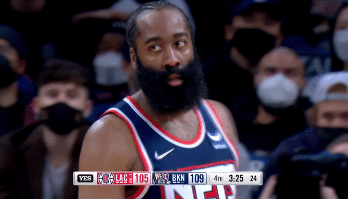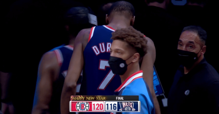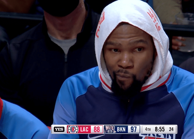 末节,哈登继续砍分,杜兰特输送三分火力,不过快船仍旧顽强反扑,终场前2分35秒两队打成110平,关键时刻,杜兰特中投,温斯洛两罚全中,哈登两罚一中,温斯洛关键两分,曼恩三分准制胜一击,关键时刻,篮网被快船打出25-8超级攻势,篮网连续三分不中,哈登两罚全中续命,快船点球战术,杜兰特两罚一中,杜兰特超远三分没有,最终篮网主场4分惜败快船,对于这次失利,杜兰特和哈登一脸沮丧。