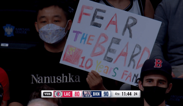 下半场,杜兰特第三节依旧没有大爆发,但哈登彻底打疯了,单节投进4记三分,再加上连突带罚不断涨分,单节独砍16分,不仅扛起篮网进攻大旗,而且单节送出5次助攻还抢到4个篮板,当爹又当妈;期间,镜头给到场边,哈登的中国球迷举着标语,上面写着10年登蜜。