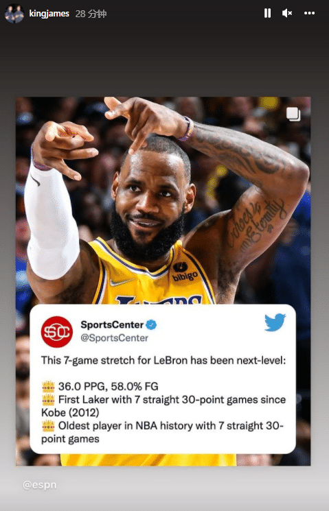来源:JRS直播网01-02 09:53JRS直播网01月02日讯 37岁詹姆斯仍旧打出超强统治力,不久前詹姆斯转发自己创造的三大纪录;美媒SportsCenter晒出詹姆斯的疯狂数据——最近7场场均36分,命中率58%;连续7场30+成为12年科比之后湖人队史首人,史上最老连续7场30+球员。