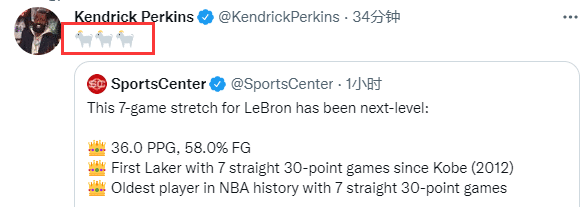 对于詹姆斯的疯狂表现,詹姆斯前队友、现担任评论员的帕金斯发推盛赞詹姆斯是历史最佳(3个山羊表情,代表GOAT历史最佳)。
