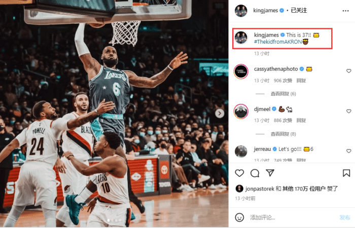 昨天大胜赛后,詹姆斯晒出三张赛场照,配文写道:这就是37岁(王冠表情)#那个来自阿克伦的孩子。