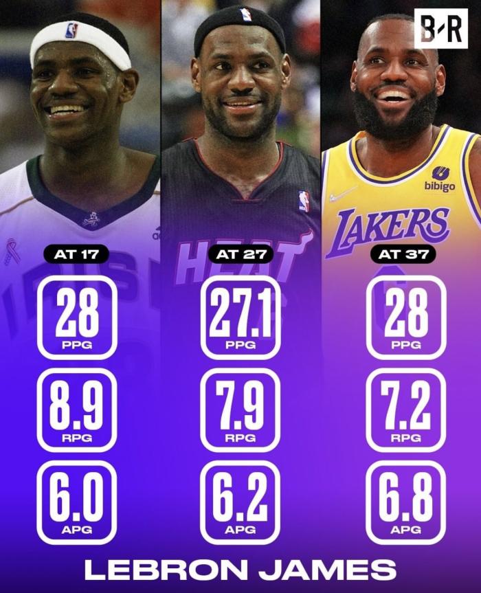 17岁场均拿到28分8.9篮板6助攻;27岁场均拿到27.1分7.9篮板6.2助攻,37岁场均7.2篮板6.8助攻,这么多年过去了,詹姆斯就像37岁新秀似的,难道球迷经常调侃老詹出道即巅峰,而且多项数据创生涯新高。