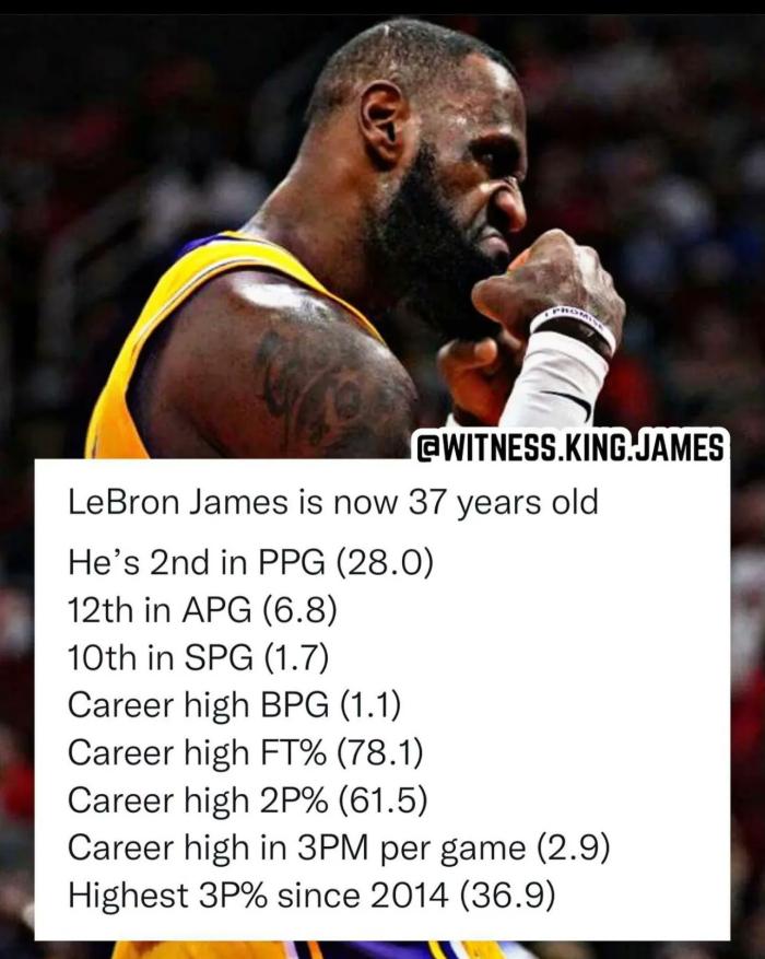 37岁詹姆斯仍旧打出疯狂的表现——场均28分仅次于杜兰特排在联盟第二,场均6.8次助攻联盟第12,场均1.7次抢断联盟第十,罚球命中率(78.1%)、两分球命中率(61.5%)、场均三分命中数(2.9记三分)三项数据都是生涯新高,场均1.1次盖帽追平生涯最高,三分命中率是2014年后最高的。