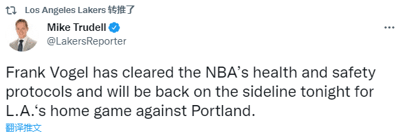 来源:JRS直播网01-01 10:51JRS直播网01月01日讯 ,湖人主帅终于回来了,湖人官方转发随队记者MIke Trudell的报道,沃格尔已经解除健康与安全协议,并将在今晚主场对阵开拓者的比赛中重返赛场。