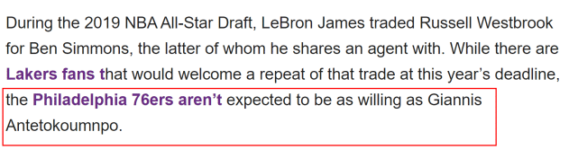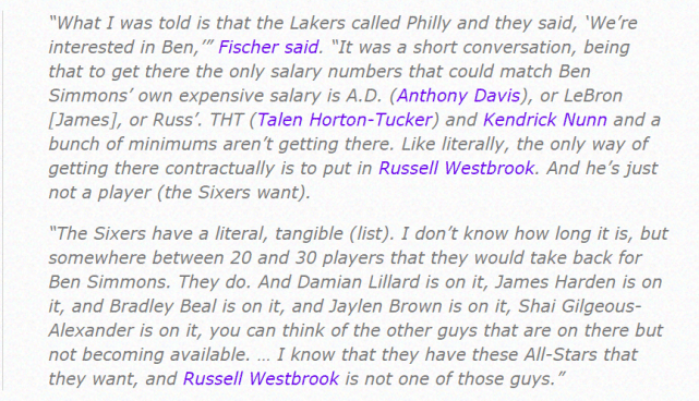我被告知湖人给费城打过电话,他们说‘我们有兴趣得到本(西蒙斯)……’这是一个简短的谈话“,因为能够配平西蒙斯薪水的湖人球员只有戴维斯、詹姆斯或者威斯布鲁克。”Fischer说道,“霍顿-塔克、纳恩和一堆底薪合同是无法换来西蒙斯的。从字面上来理解,得到西蒙斯的唯一方式就是送走威斯布鲁克,但他不是76人想要的球员。”