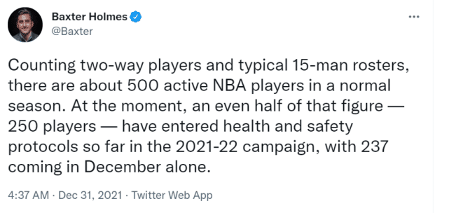 来源:JRS直播网12-31 15:36JRS直播网12月31日讯 ,据ESPN记者Baxter Holmes报道,截至今日,NBA已有250名球员触发健康安全协议,而正常赛季算上双向球员,NBA大概有500名球员。换言之,本赛季已经有一半球员有过触发协议的经历。仅12月这一个月份,就有237名球员触发协议。