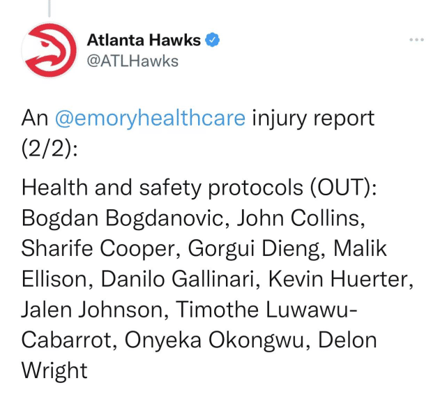 最惨的是老鹰队,虽然路威和艾旺杜解除协议,可以出战骑士的比赛,但队内依然有11名球员处于隔离状态下,他们是博格达诺维奇、吉昂、马利克-埃里森、德朗-赖特、约翰-科林斯、杰伦-约翰逊、加里纳利、鲁瓦乌、赫尔特、库珀和奥孔古。算上因伤缺阵的所罗门-希尔和亨特,老鹰将有13名球员缺战骑士。