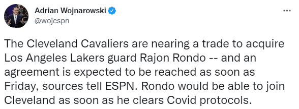 来源:JRS直播网12-31 11:15北京时间12月31日,自从新赛季开打之后,湖人队第一笔交易即将达成,据espn名记沃纳罗斯基报道,湖人和骑士已经接近达成朗多的交易,这笔交易最快明天正式达成;骑士想要引援朗多的最大原因是塞克斯顿、卢比奥先后赛季报销,他们的后场太缺人。
