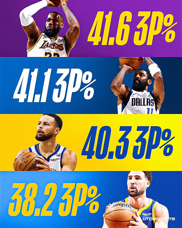 赛季至今,詹姆斯场均拿到25.4分7.3篮板8.1助攻,投篮命中率53.3%和三分命中率41.6%,三分命中率创生涯新高,本赛季詹姆斯的三分命中率比库里、汤普森和欧文还准。