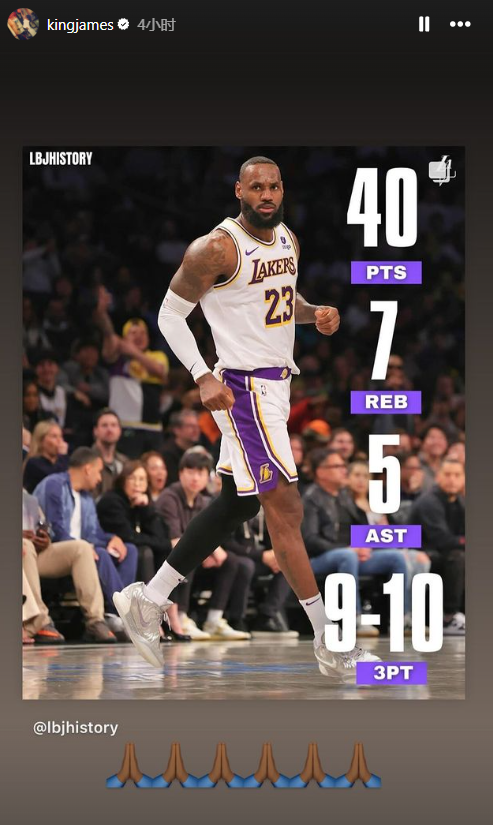 来源:JRS直播网04-02 13:13JRS直播网讯 北京时间4月2日,湖人当家球星勒布朗-詹姆斯连续更新社交媒体,庆祝自己命中9记三分狂砍40+,晒影子戴王冠照还转发一大纪录。