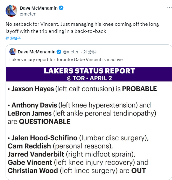 根据赛程,湖人将迎来客场背靠背,明天客战猛龙,詹姆斯和浓眉都被列为出战成疑,预计他们都会继续上场;海斯伤停一场后大概率出战;席菲诺、雷迪什、范德比尔特、文森特和伍德缺席比赛,其中文森特复出一场后再次休战,他没有遭遇任何挫折,仅仅是为了伤病管理。