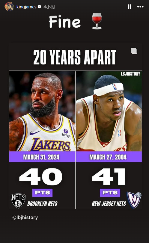 詹姆斯还转发一大纪录并配文:红酒,越老越醇香——2004年3月28日,詹姆斯对阵新泽西篮网拿到41分,时隔20年,詹姆斯对阵布鲁克林篮网拿到40分。