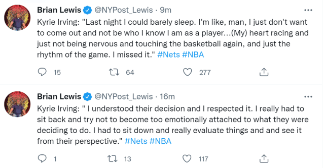 谈到自己回来的感受,欧文说:“昨晚我几乎一夜难眠,我不想自己回来后的状态不像我自己预期的那样。我的心跳加速但又不想紧张,再次触碰到篮球,感受比赛的节奏,我想念它了。”