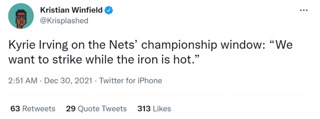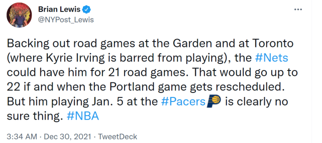 那么,欧文能出战多少场客场比赛呢?篮网记者Brian Lewis写道:“除了尼克斯和猛龙的比赛(欧文因未打疫苗不被允许参加),篮网还能最多让他出战21场客场比赛。如果算上推迟的开拓者的比赛,就能上升到22场,不过,欧文能否在1月6日(北京时间)对步行者的比赛中上场,还不确定。”无论如何,欧文能回来对篮网就是一大利好,期待三巨头的再次合体。