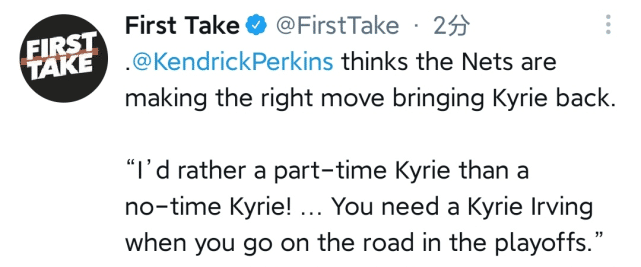 球评帕金斯在最新一期的First Take节目上也谈到了欧文的回归,他认为篮网做出了正确的决定。“比起一个完全不上场的凯里(欧文),我更想要一个兼职上场的凯里……在季后赛的客场比赛中,你需要一个凯里-欧文。”