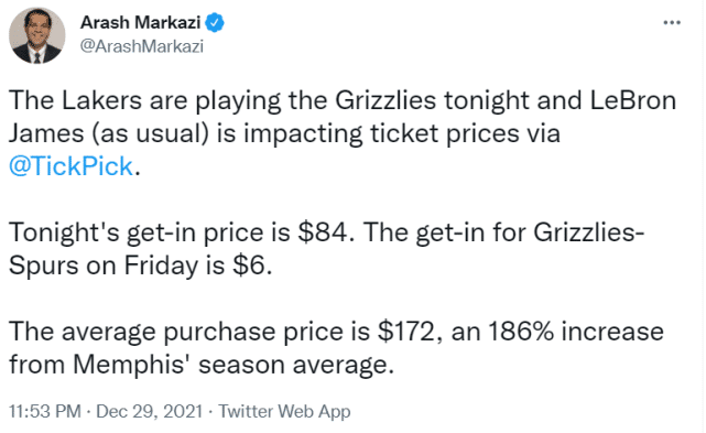 灰熊球票均价上涨186%,詹姆斯巨星效应!最低价6美元变84美元