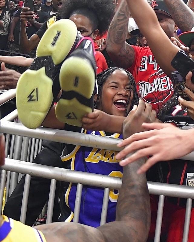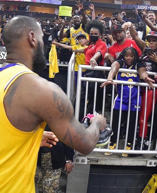 除了现场观看到精彩的比赛,球迷还有望收获球星签名或者球鞋。对火箭一战赛后,解锁36000分里程碑的詹姆斯心情大好,就把球鞋送给了场边的一位小球迷,小球迷兴奋大喊。这场比赛,说不定又会有哪位球迷成为幸运儿。当然,穿上湖人6号球衣来观战,应该会提升一些撞大运的概率。