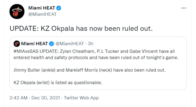 根据热火官方公布的伤病情况,奇塔姆、PJ.塔克和文森特都触发健康安全协议,算上之前的洛瑞、阿德巴约和斯特鲁斯,热火有6名球员隔离。另外,戴德蒙、莫里斯、奥拉迪波、巴特勒都因伤缺阵。热火紧急从G联赛签下霍尔曼,希望能让比赛激活人数达到8人,避免延期。不过,最终,原本出战成疑的欧克帕拉由于腕伤确定缺席,激活人数也降至7人,无法满足联盟的最低人数要求。