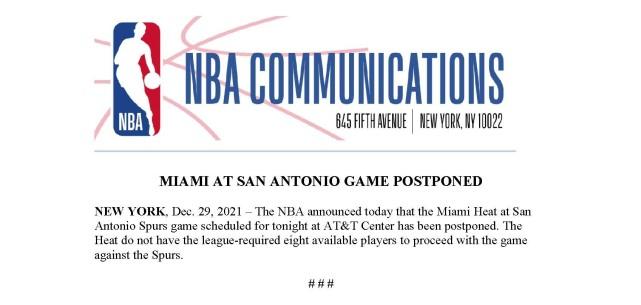 NBA官宣第10场比赛延期!热火凑不足8人:今日对马刺一战推迟