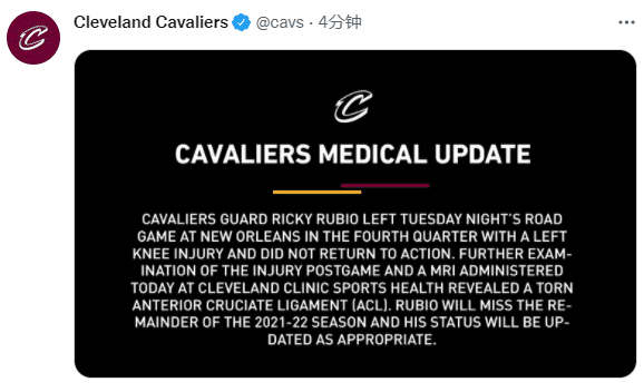 在昨天骑士对阵鹈鹕比赛最后一节,卢比奥在持球突破时倒地受伤,当时卢比捂着膝盖十分痛苦,由于左膝目前不能承重,随后他被奥科罗和乐福搀扶离场,退场前,卢比奥得到27分13篮板9助攻,因伤提前退赛太不幸;如今卢比奥的伤情确诊,左膝前交叉韧带撕裂,赛季报销。